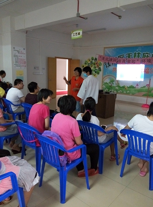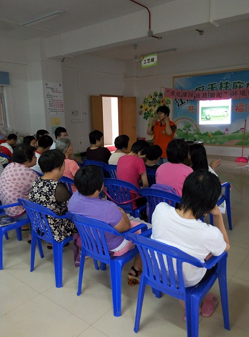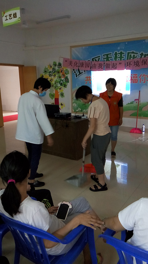 智力残疾人主要存在智力水平与适应性行为障碍,而适应性行为的发展主要取决于智力残疾人个体生活、人际沟通、社会参与以及建立稳定的职业生涯等生活技能的改善。为此,2016年5月20日,江门市江海区天健社会工作综合服务中心于江海区天柱庇护中心组织28名学员举行一场以“美化康园,由我做起”为主题的环境保洁培训活动,藉此提高智力残疾学员的日常生活、工作技能与社会参与技能。