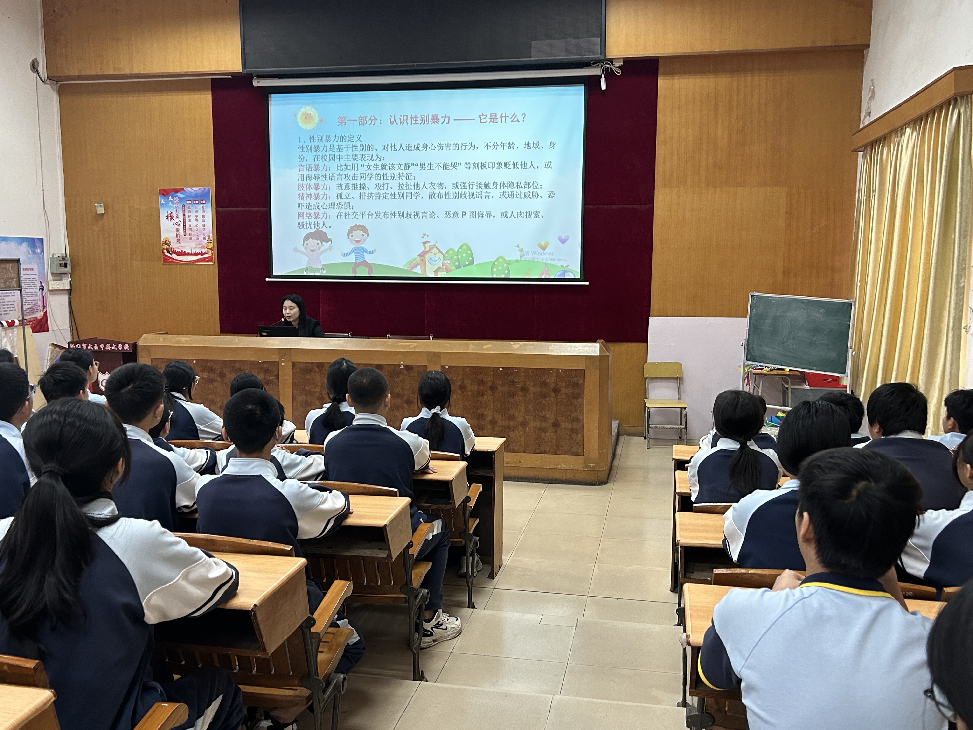 本次活动邀请广东国晖(江门)律师事务所陈振强律师和广东金桥百信(江门)律师事务所吕玉玲律师分别采用法律解读、案例剖析、互动问答等形式,围绕《中华人民共和国未成年人保护法》《中华人民共和国反家庭暴力法》等法律法规内容,进一步剖析校园欺凌、语言暴力、网络暴力等典型案例,以案释法、以法论事,用通俗易懂的语言向师生解析性别暴力的表现形式、法律后果及应对措施,增强师生的法治思维。