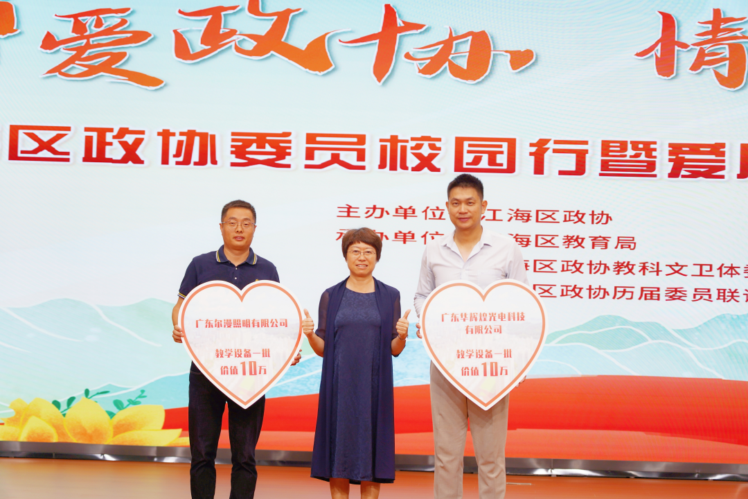 张海涛热衷社会公益,长期致力于改善民生。在了解到江海区部分公办学校照明设备老化影响学生学习环境后,他带领公司参与“政协委员校园行”活动,捐赠10万元教学设备改善学校照明条件,为师生创造更优质的学习环境。
