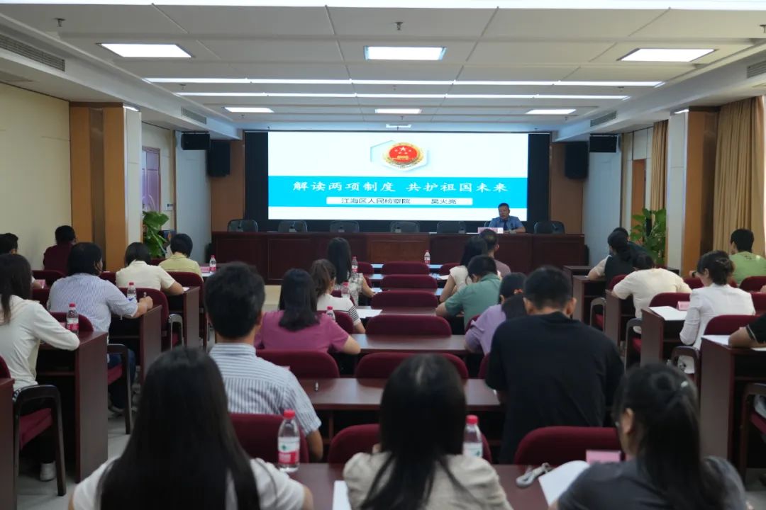 吴火亮检察长首先介绍了近年来江海区检察院涉未成年人性侵案件的办理情况,分析案件的特点和存在的问题,随后围绕《关于建立侵害未成年人案件强制报告制度的意见(试行)》和《关于建立教职员工准入查询性侵违法犯罪信息制度的意见》两项制度,结合典型案例,就具体规定、如何落实、落实不力的责任追究等方面进行了详细解读,并向与会人员发出倡议,组织学校教职员工深入学习两项制度,更加关注学生成长,严格履行相关职责,努力营造安全的校园环境。