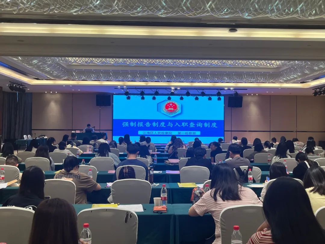 8月23日下午,江海区检察院未检干警还走进江海区2023年新入职教师培训班,为全区100多名新入职教师开展强制报告制度和入职查询制度的法治宣讲,让他们在开启教师职业生涯之初便加深对两项制度的认知和了解,增强报告意识和责任担当,积极参与到未成年人保护工作中来。