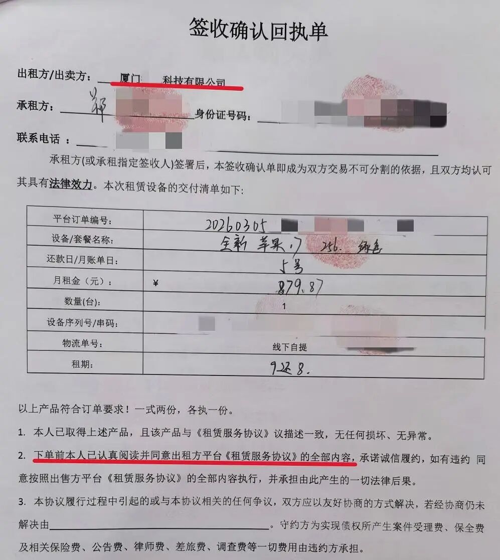 (套路一:签署合同的主体并非“爱某数码店”,而是第三方平台;套路二:合同明确提示消费者已知晓租赁协议内容,但实际上消费者根本未认真查看条款,在后续维权时店家可以此抗辩)