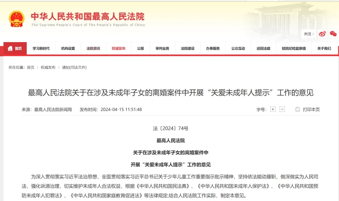 近日,最高人民法院发布《关于在涉及未成年子女的离婚案件中开展“关爱未成年人提示”工作的意见》(以下简称《意见》),对影响未成年人身心健康行为进行早期预防,将防治未成年人犯罪工作关口前移,避免离婚纠纷对未成年人产生不利影响,切实维护未成年人合法权益。