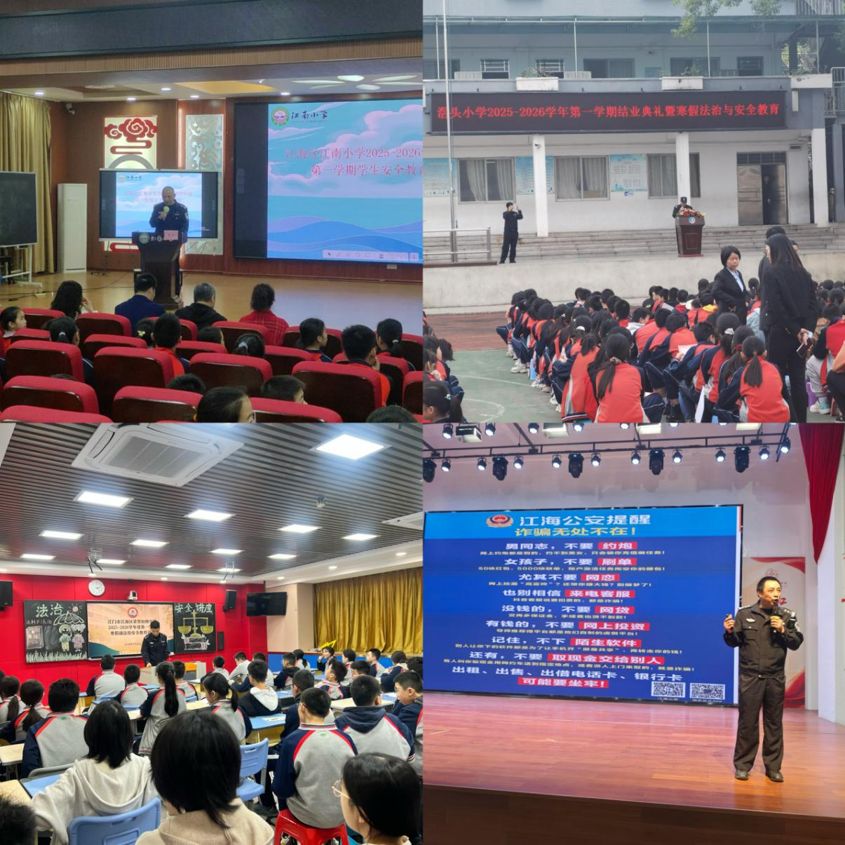 寒假前夕,礼贤小学、新民小学、华兴小学等学校法治副校长在结业典礼上围绕交通安全、消防安全、防溺水等重点内容开展法治安全教育。市公安局江海分局组织民警开展反诈主题宣传,结合网络游戏诈骗、冒充熟人诈骗等真实案例,剖析诈骗手法、揭示话术陷阱,引导学生提升识别与防范能力,夯实假期安全基础。