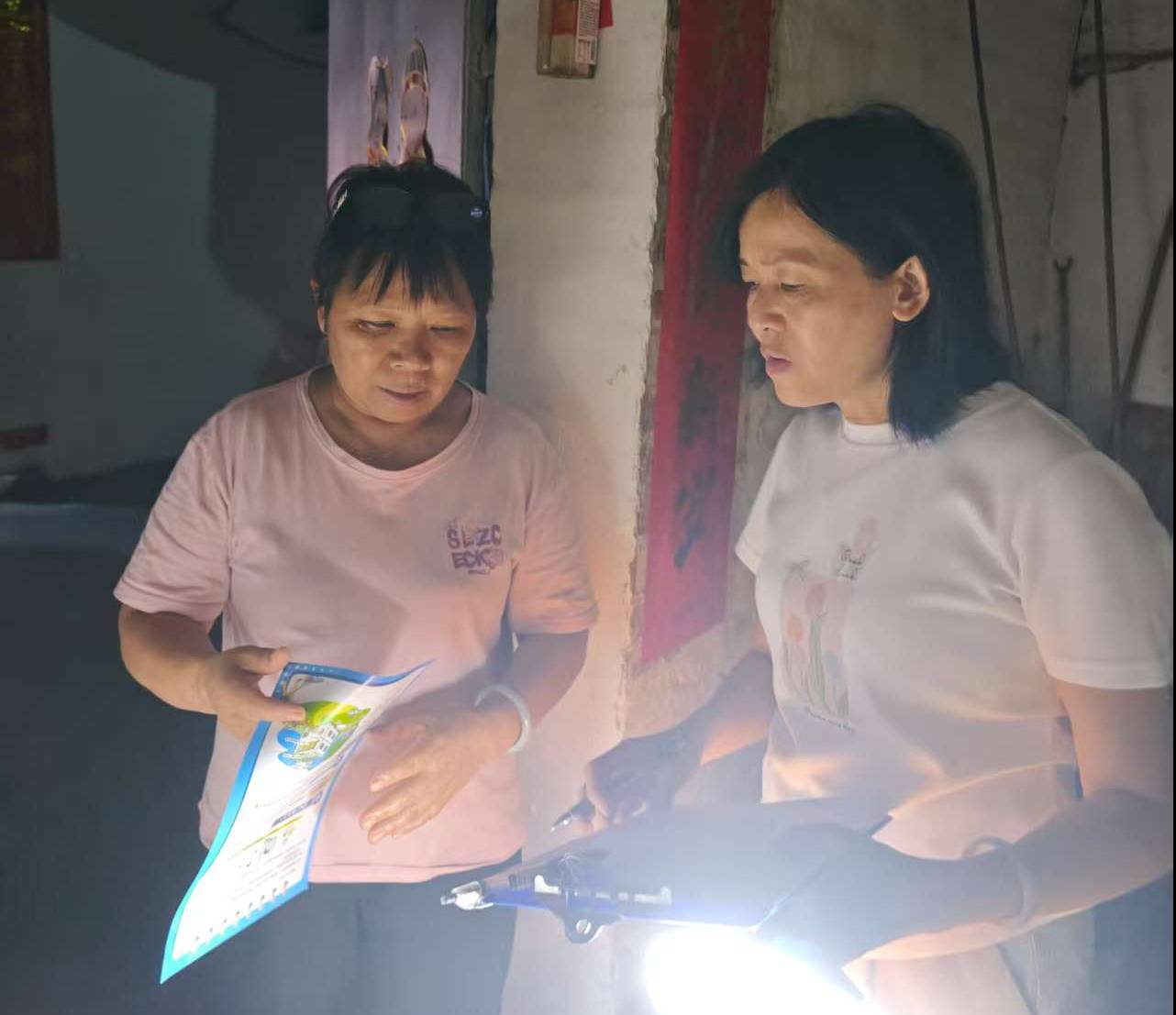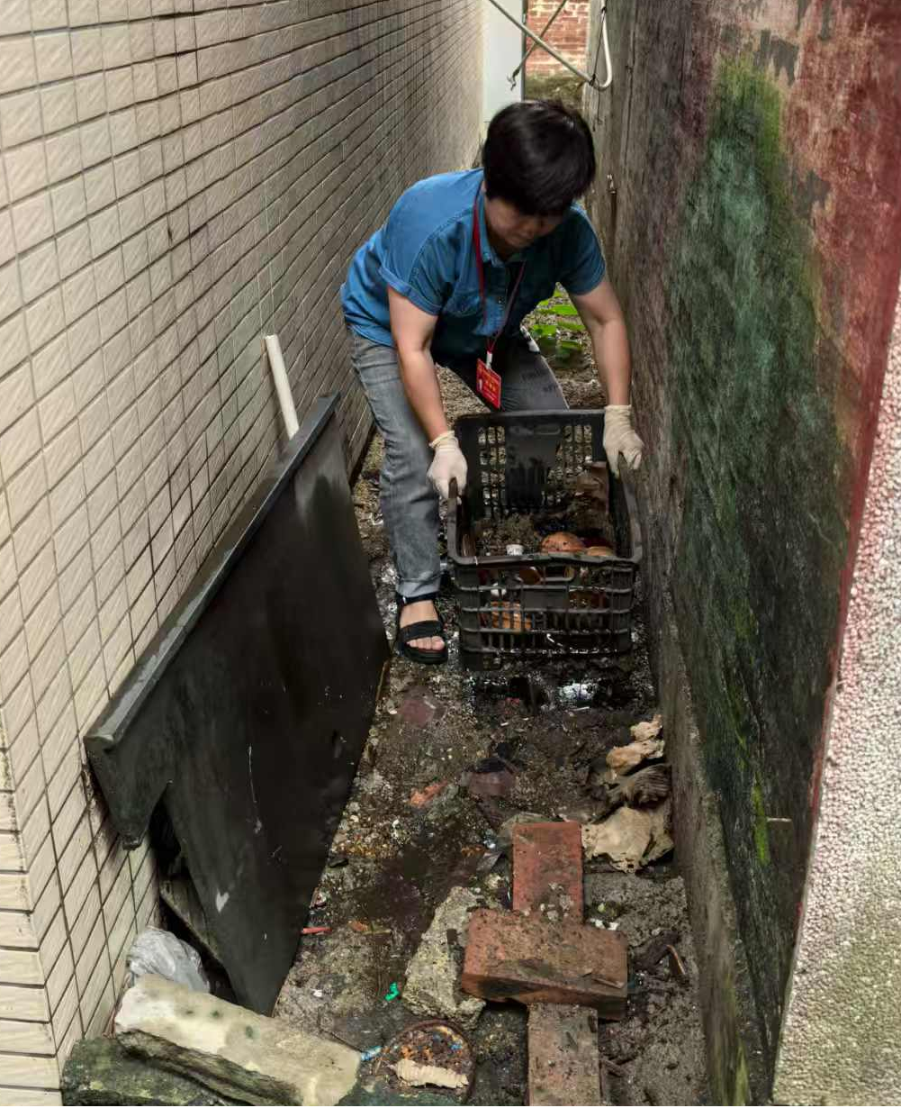 为了让防控无死角,黄颖妍带领团队开启“白加黑”“五加二”模式:白天组织社区干部、街长团队、下沉干部及志愿者入户宣传,手把手教居民清理卫生盲区;晚上汇总数据,规划次日行动。通过“干部带头+群众参与+自治联动”的多元模式,275人次加入清理队伍,11场次爱国卫生运动火热开展,超2吨杂物垃圾被清运出门。她还拉上新南小区业主委员会一起发力,加装26盏灭蚊灯,加密灭蚊消杀频次,修建遮光树枝,让居民自治力量成为防疫“生力军”。