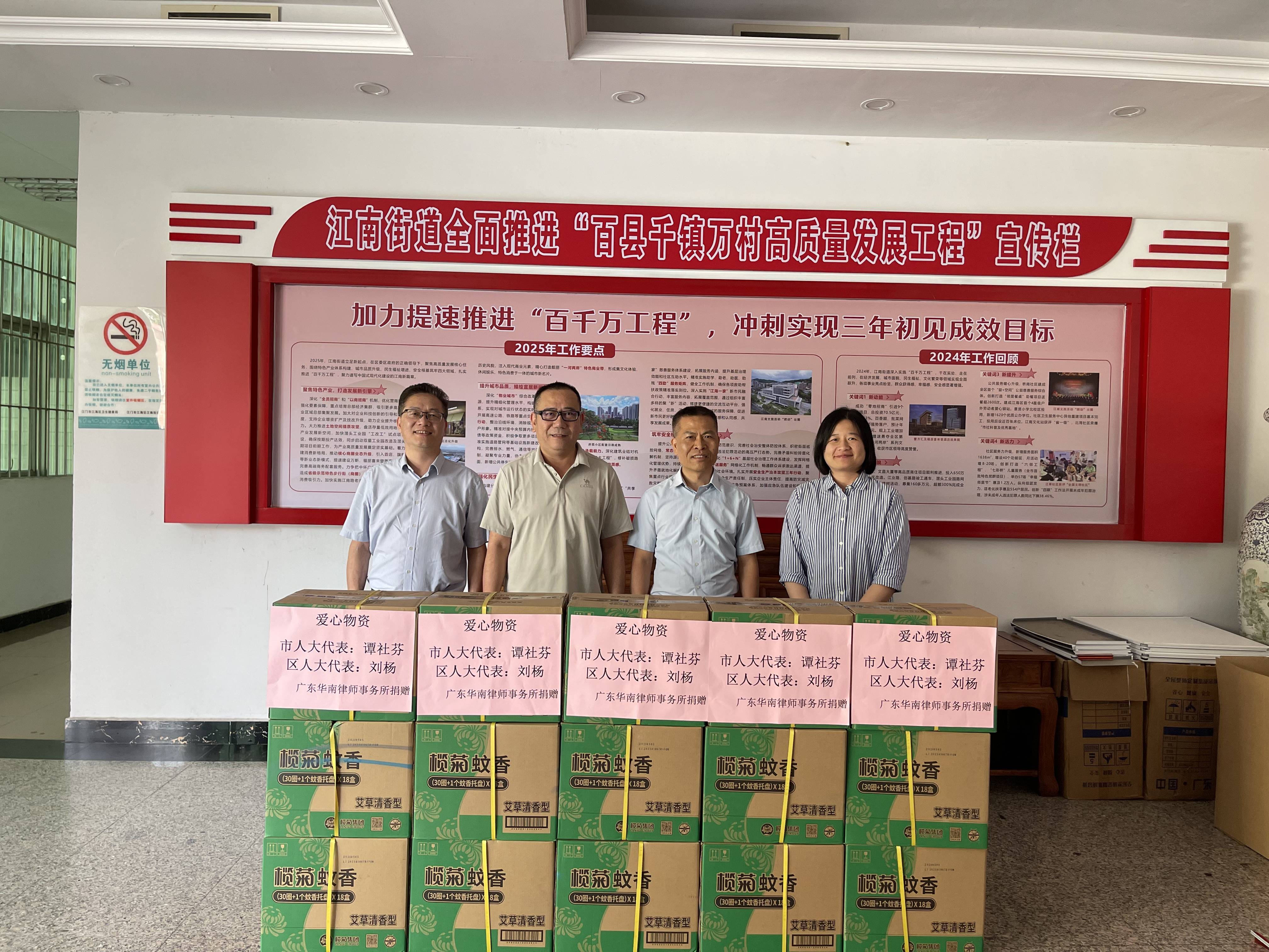 同样心系群众防护的,还有市人大代表、广东华南律师事务所主任谭社芬和区人大代表、广东华南律师事务所副主任刘杨。得知江南街道防疫一线急需防蚊物资,他们立刻联系采购,向江南街道捐赠价值近2700元的蚊香15箱。“这些蚊香虽不贵重,但能帮大家在夜里睡个安稳觉,也能少些被蚊子叮咬的风险。”简单的话语里,藏着对群众的贴心关怀。