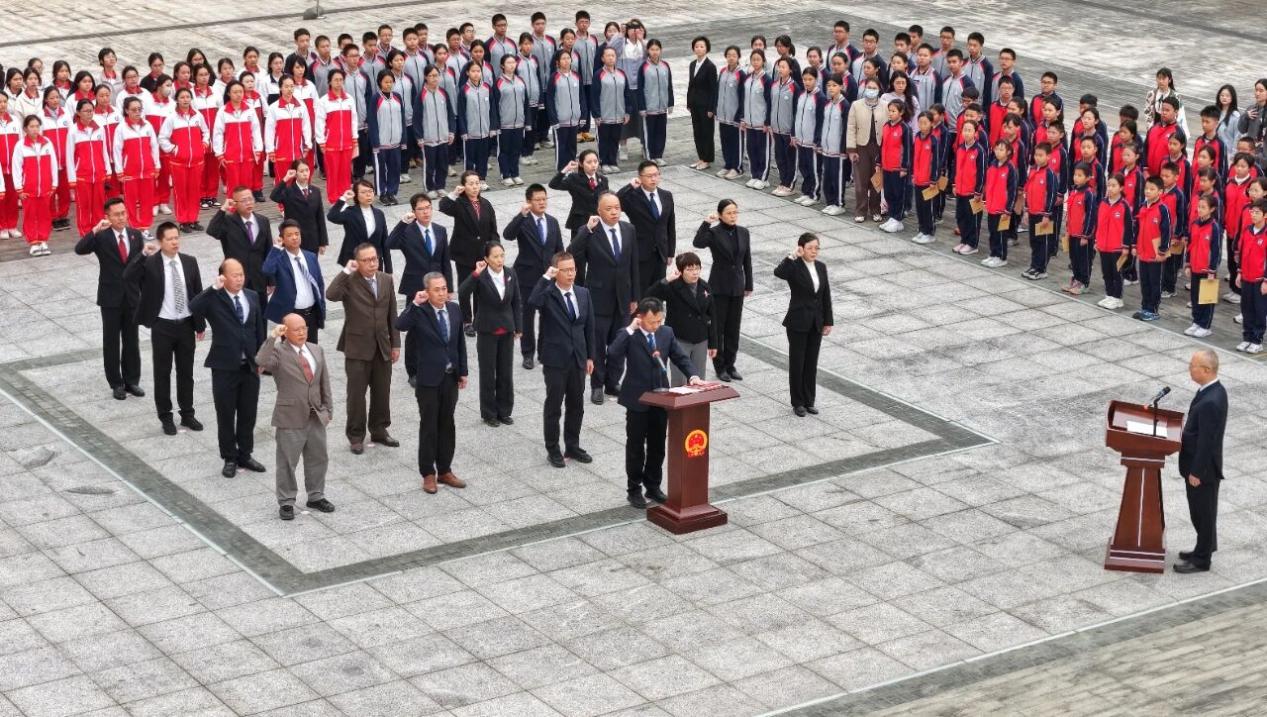 在领誓人的带领下,新任命的国家工作人员面向国旗和宪法,右手举拳,庄严宣誓:“忠于中华人民共和国宪法,维护宪法权威,履行法定职责……”宪法誓言,字字千钧,表达了他们对宪法的忠诚和对法治的坚守。来自广东江门幼儿师范高等专科学校、礼乐中学、景贤实验学校、江门市十一中学天鹅湾小学250师生共同见证这一重要时刻