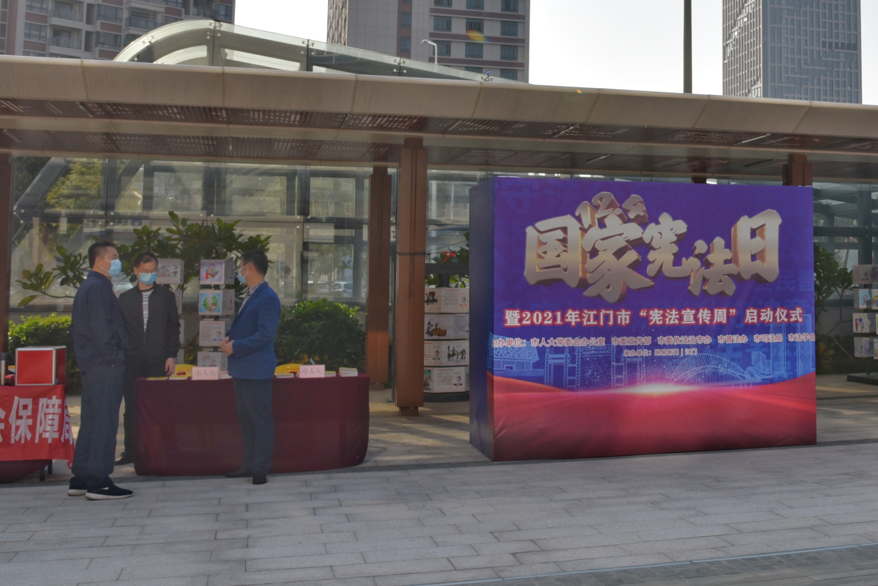 2021年11月30日下午,12·4国家宪法日暨2021年江门市“宪法宣传周”启动仪式、江海区12·4国家宪法日暨法治江海宣传周暨宪法民法典暨全国基层立法联系点一周年图片巡展在江海区法治广场拉开帷幕。江门市人大常委会副主任钟军,江海区人大常委会主任余志坚,江海区委副书记、区人大常委会党组副书记易立,江门市司法局副局长胡振宇,江海区人大常委会副主任陈国纯,江海区司法局局长邱华德等出席活动。