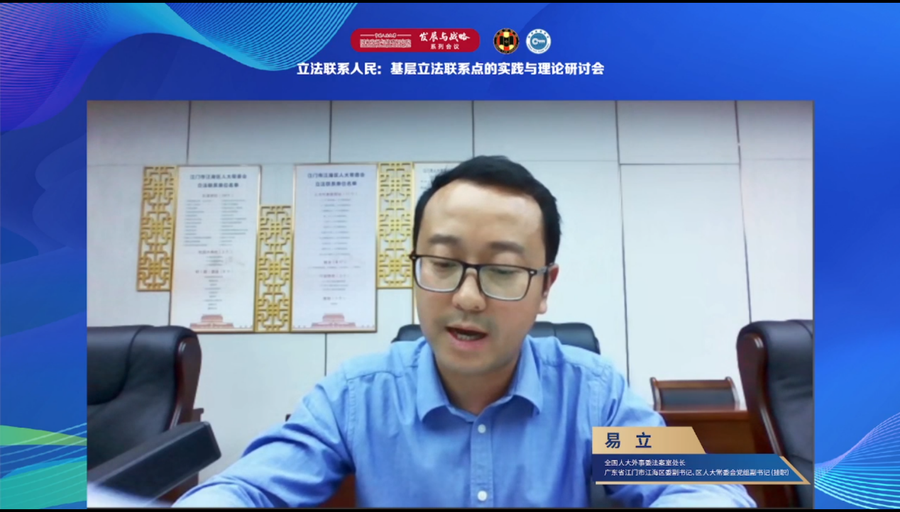 江门市人大常委会和江海区人大常委会高度重视此次研讨会,在江海基层立法联系点活动中心设立分会场,认真听会学习。市人大常委会法工委主任侯明飞等同志参会。全国人大外事委员会法案室处长、挂职江海区委副书记和区人大常委会党组副书记的易立同志代表江海基层立法联系点发言。