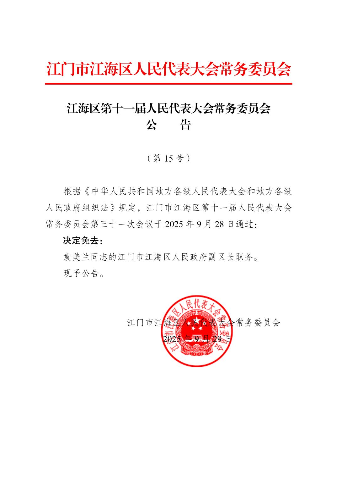 江海区第十一届人民代表大会常务委员会公告(第15号)