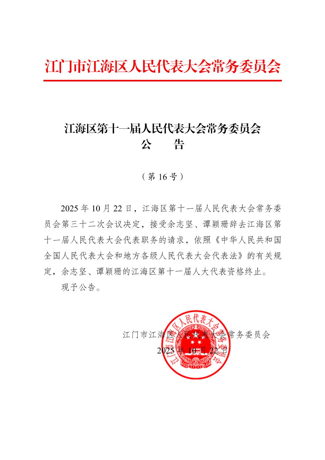 江海区第十一届人民代表大会常务委员会公告(第16号)
