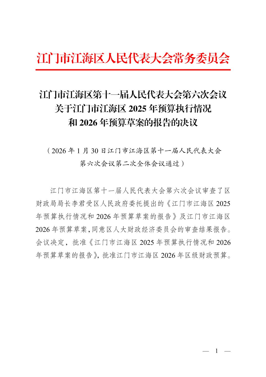 江门市江海区第十一届人民代表大会第六次会议关于江门市江海区2025年预算执行情况和2026年预算草案的报告的决议