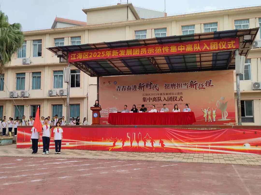 为深入贯彻习近平总书记关于青年工作的重要思想,践行党、团、队一体化培养体系要求,加强少先队员和团员的政治引领,4月30日,“青春奋进新时代 挺膺担当新征程”江海区2025年新发展团员示范性集中离队入团仪式在外海中学庄严举行。外海中学团员教师、新发展团员以及八年级全体学生参加本次活动,团区委副书记余泳诗、区教育局政体股负责人李润昌、外海中学副校长何健强出席活动。