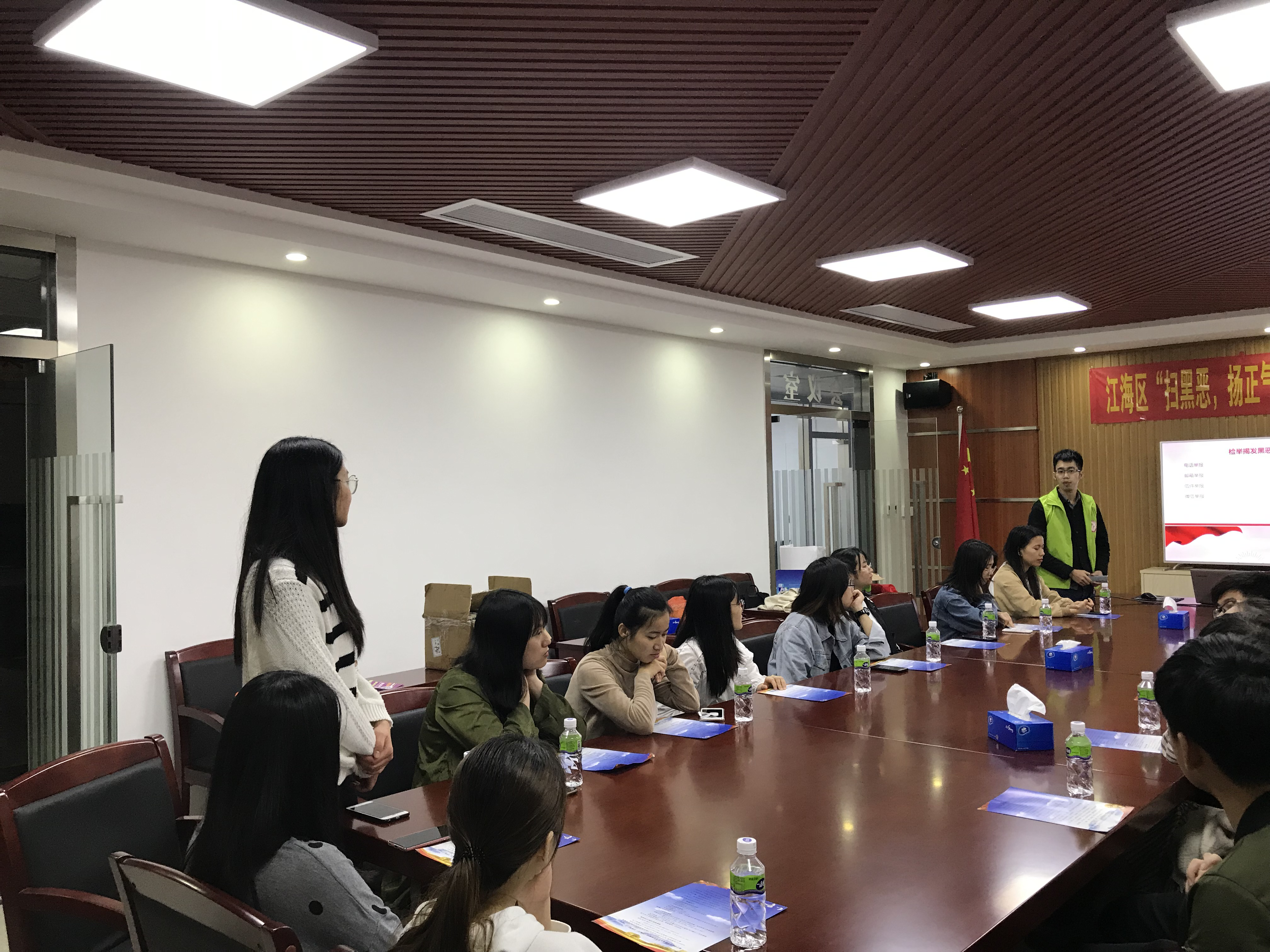 活动现场通过PPT展示、视频观看以及分享感受三个环节进行开展。社工通过PPT的展示向青少年们普及关于扫黑除恶的知识和有关法律的常识,旨在增强青少年的法制意识,引导青少年遵守法律法规,学会辨别身边的黑恶势力,知道几种举报的途径。活动第二环节,社工通过播放扫黑除恶的宣传片以及微电影的案例分析让青少年更加了解扫黑除恶专项斗争工作的重要性。活动的最后环节,社工对参与者进行分组讨论巩固参与者通过本次讲座所学到的知识,并上台进行分享。