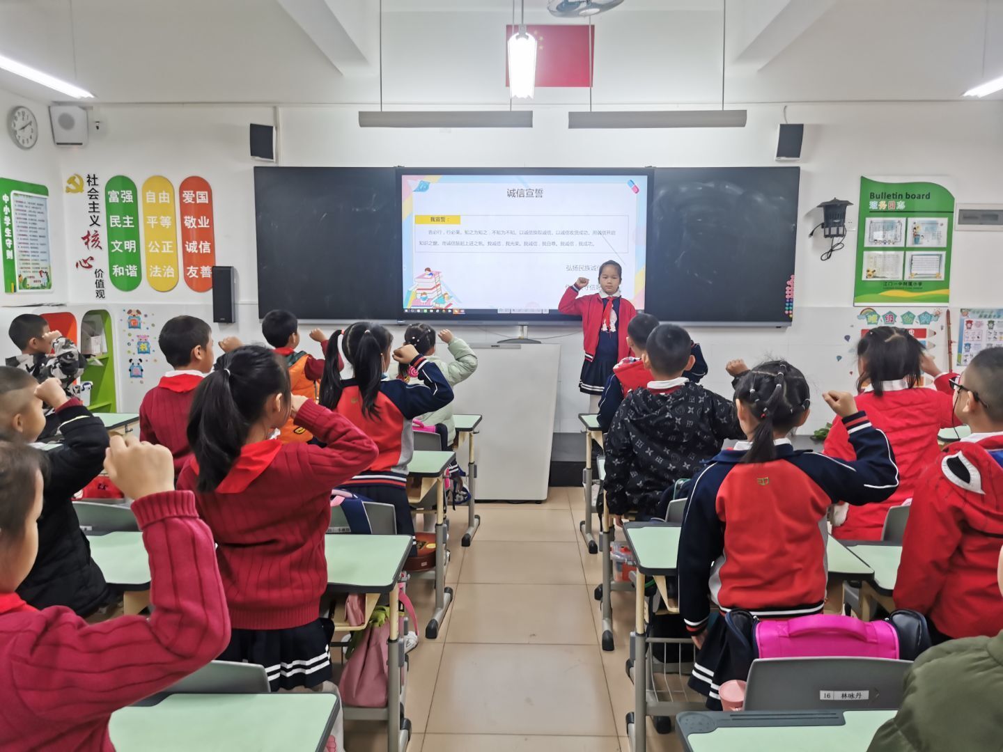 各班开展“诚信华彩少年”的评选,并由班级评选的“诚信华彩少年”带领宣誓,“我宣誓:言必行,行必果……”通过庄重的诚信宣誓仪式,加深学生对“诚信”一词的理解和感受,为日后的践行提供坚定思想基础。