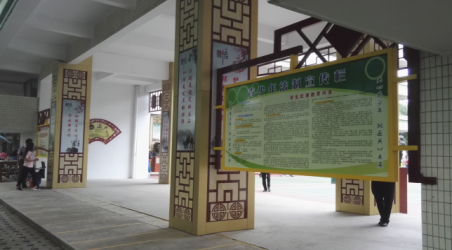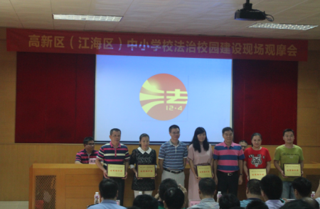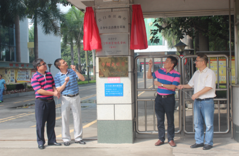 本次活动主要为设立在礼乐中学的“江门市江海区青少年法治教育基地”揭牌,这意味着我区的“青少年法治教育基地”正式建立。礼乐中学在法治文化校园创建方面十分重视,也想了很多办法。该校考虑到法治文化项目应当兼顾学生集中活动的区域及坚固耐用、遮风挡雨的要求,不宜过于分散,且范围也不宜过大,故选点在该校勤勉楼架空层及周边空地建设以“礼”和“法”为主题的法治文化长廊。该校聘请专业人士为该项目量身度做各项装饰设计,经过反复研究和修改,确定选取以樑、柱、墙等建筑为载体,以吊牌、石刻造型、宣传栏等艺术表现手法,通过名言警句、法治漫画、法治标语等形式,向在校师生传播法治文明、法治理念、法治常识。这与礼乐中学此前已有的莘莘学子建筑设计风格交相辉影,和谐协调,突出“礼”、“法”结合的重点,在校内营造知礼守法的浓厚氛围,深受师生的喜爱和欢迎。与会人员跟随礼乐中学副校长卢美颜沿路参观,对每一处的设计风格拍照学习。参观期间收听礼乐中学“校园普法空间站”的播放,独具特色的访谈类播放形式,配以音乐背景,加上装修一新的广播站台,让参观者们留下了深刻的印象。有学校表示礼中经验值得借鉴,希望以此为契机,回去向学校主要领导汇报,以点带面铺开法治校园的建设。