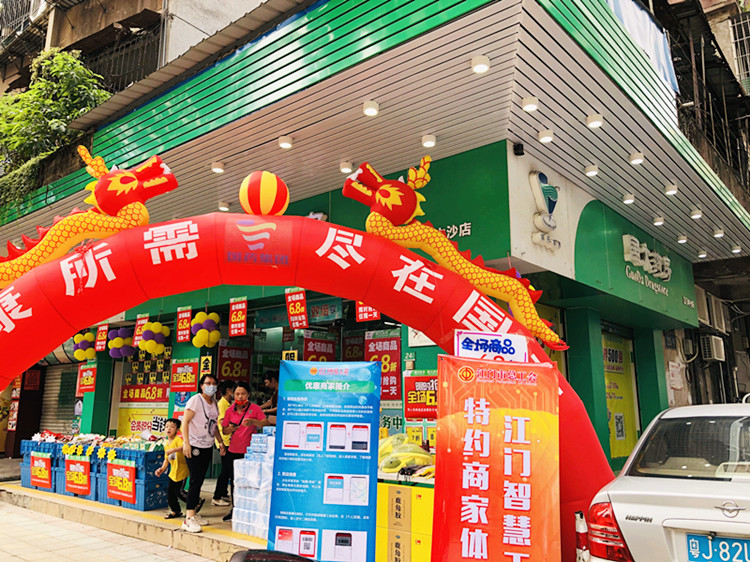 10月2日,江海区总工会组织工会职工到江门国大(江海区中沙以及麻园店)开展“江门智慧工会新版”优惠商家以及智慧工会付款码功能宣传活动。