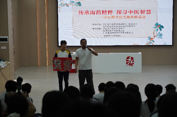 中医药文化是中华优秀传统文化的重要组成部分,蕴含着深厚的哲学思想和丰富的实践智慧。为传承弘扬中华优秀中医药文化,增强青少年对本土传统文化的认同感与自豪感,近日,江海区政协组织开展“传承南药精粹,探寻中医智慧”中医药文化校园实践活动,邀请江海区政协委员、广东道地南药良仓科技有限公司中医药专家王军东走进礼乐中学,为百余名学生带来了一场兼具知识性与趣味性的传统文化课堂,让青少年近距离感受中医药文化的独特魅力。